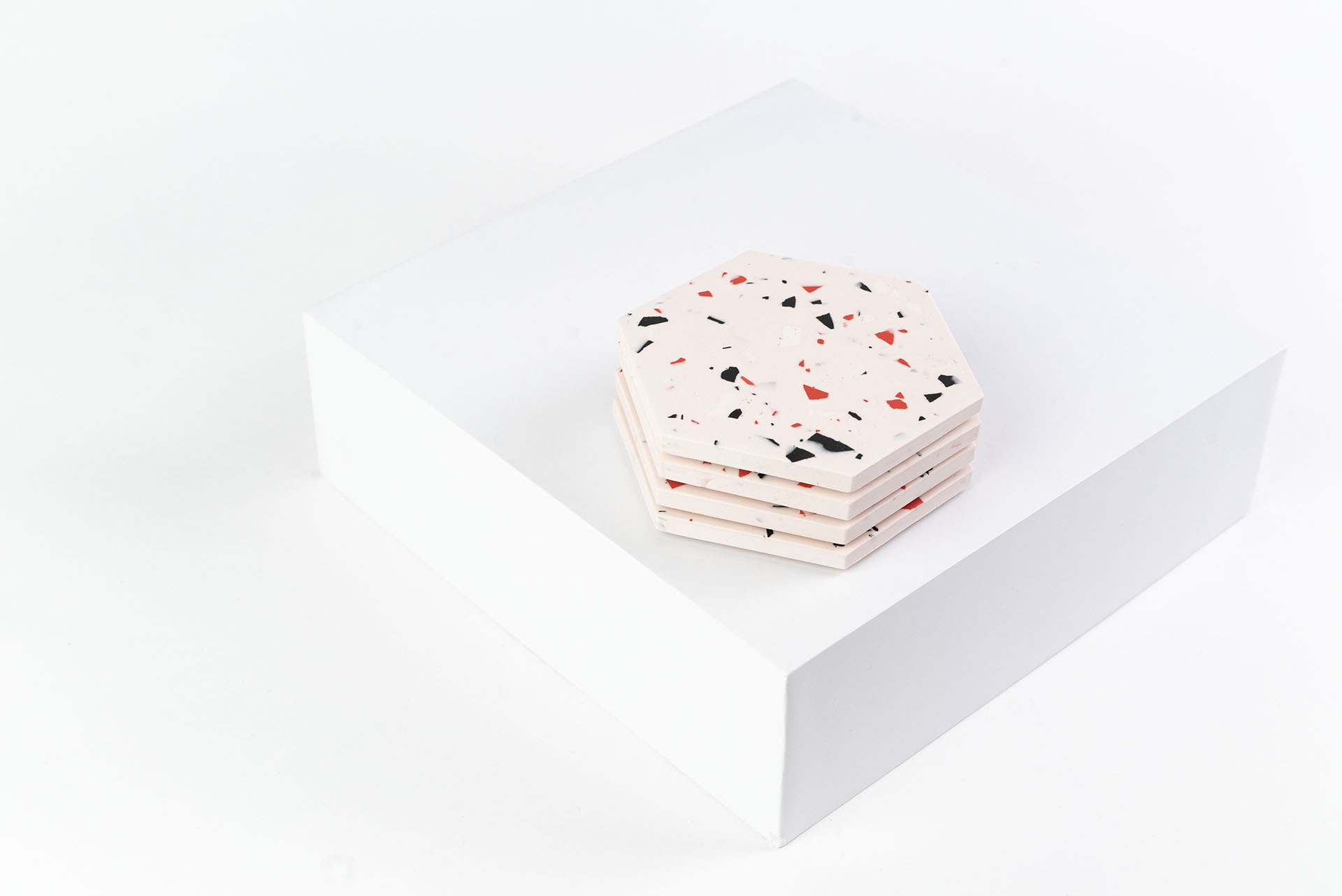 Treat yourself to this beautiful set of four Jesmonite coasters, hand sealed with food grade beeswax. Our coaster sets are timeless pieces, sporting a unique design and made only from quality materials. It will protect your surfaces and complement your interior decor with flair. Each coaster is cushioned on the back to optimize its grip on all surfaces. These gorgeous, heavy-duty, terrazzo-finished coasters are a great choice for decorating your home, office or simply to offer as a gift.